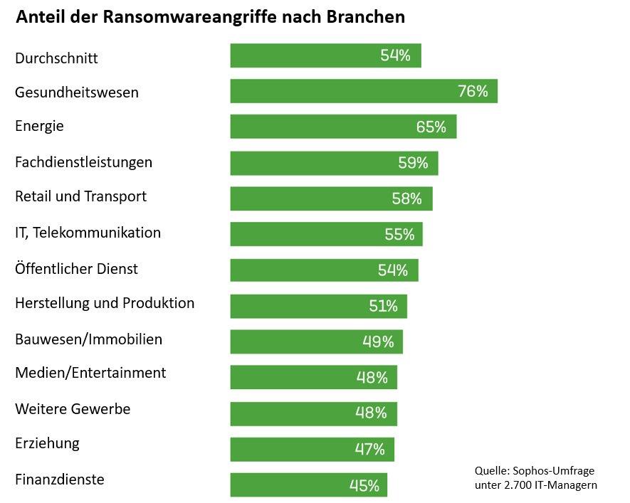 76 Prozent und damit die meisten Attacken hatten Unternehmen der Gesundheitsbranche im Visier. Mehr noch als Finanzdienstleister. „Ein Erklärungsansatz hierfür könnte sein, dass die Healthcare-Branche oft über eine veraltete IT-Sicherheitsinfrastruktur verfügt und somit als so genanntes Soft Target stärker von Ransomware anvisiert wird,“ sagt Michael Veit, Technology Evangelist bei Sophos. „Zudem kann man aufgrund der besonderen Sensibilität der Daten im Gesundheitswesen davon ausgehen, dass die Bereitschaft zu zahlen eher vorhanden ist.“
