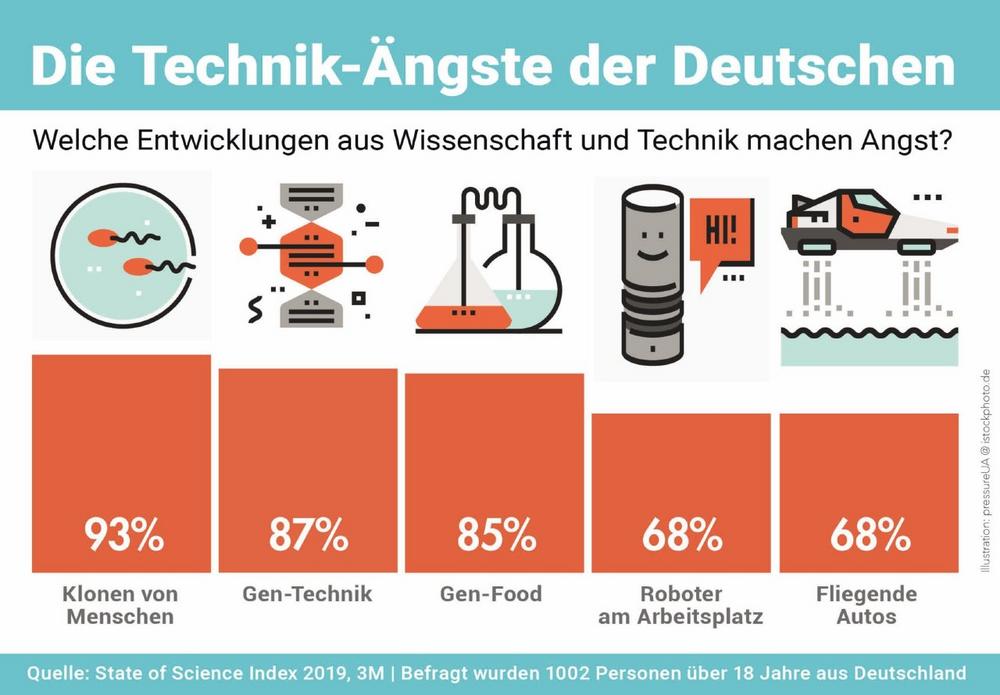 Laut Umfrage ist die grundsätzliche Stimmung gegenüber der Wissenschaft weiterhin sehr zurückhaltend. So denkt mehr als die Hälfte der Deutschen, dass die Wissenschaft genauso viele Probleme verursacht wie sie löst (54 Prozent). Zudem gibt es Ängste vor möglichen Zukunftstechnologien. So ist für 93 Prozent der Befragten das Klonen von Menschen etwas, das ihnen Sorgen bereitet, genauso wie die Gen-Technik (87 Prozent) oder Gen-Food (85 Prozent). Der Einsatz von Robotern am Arbeitsplatz sowie fliegende Autos zählen mit jeweils 68 Prozent ebenfalls zu den Top 5-Technik-Ängsten der Deutschen.
