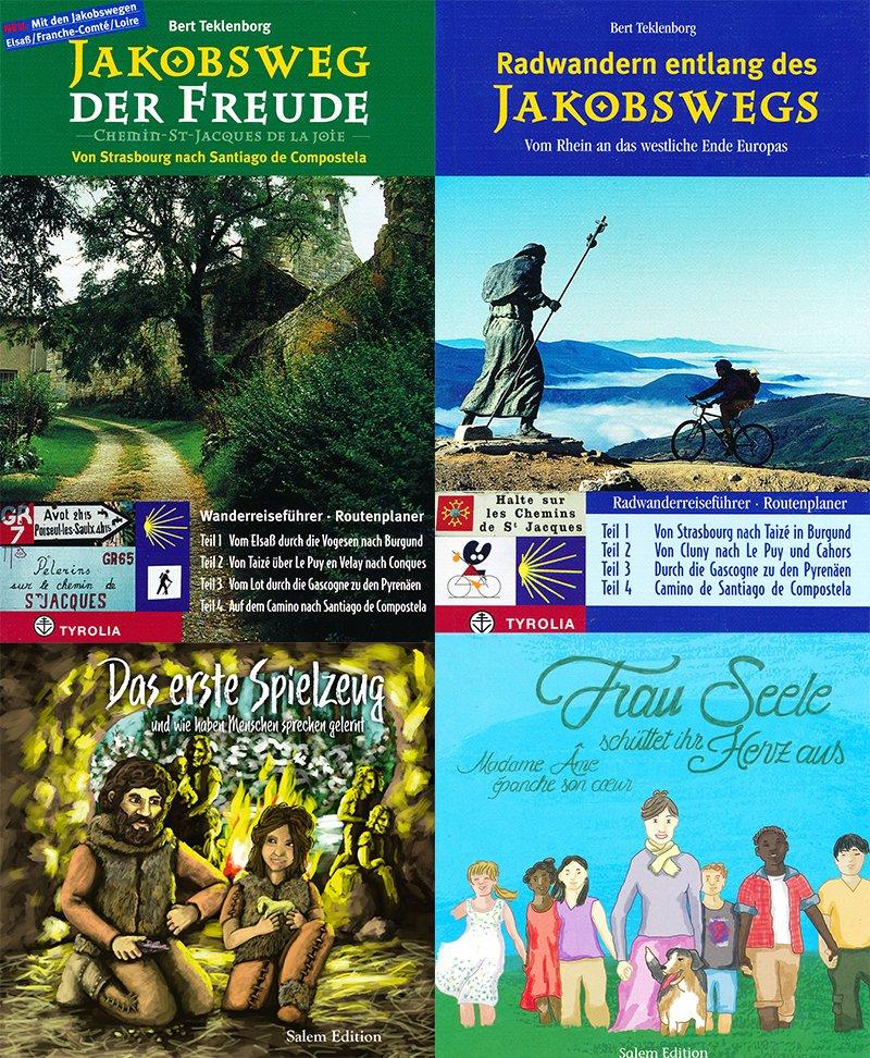 Als jüngste Neuerscheinung der Salem Edition kommt in diesem Monat „Das erste Spielzeug – und wie haben Menschen sprechen gelernt“ heraus – ein „Comic“ für Kinder und Jugendliche, die wissen wollen, wie sich der Mensch seit der Steinzeit entwickelt hat. Weitere Titel im Salem-Programm sind „Frau Seele schüttet ihr Herz aus“ – über den schwindenden Einfluss des Seelischen in der heutigen Gesellschaft –, das Lebenshilfe-Buch „SOS Hilfe für mich“ des Rundfunkpfarrers Erich Legler und der Wanderführer „Jakobsweg der Freude“, der die Frage beantwortet, wie man von Deutschland auf Wanderwegen nach Santiago de Compostela kommt: „Das war die Aufgabe beim Konzept für den „Jakobsweg der Freude“ – der beginnt in Straßburg und begleitet uns auf 2 300 Kilometern; siebenundsiebzig Karten, die schematisch den Wegverlauf nachzeichnen.“ Einem breiten Publikum bekannt wurde dieser Wanderführer durch die Erwähnung von Hape Kerkeling in dessen literarischem Reisebericht „Ich bin dann mal weg“. Und weil immer mehr radgefahren wird, kam gleich anschließend das inzwischen in 3., aktualisierter Auflage vorliegende Buch „Radwandern entlang des Jakobswegs“ dazu; von Saarbrücken, Kehl/Straßburg und Freiburg im Breisgau über wunderbare Wege fast 2300 Kilometer bis Santiago. Ein Radlertraum, den es tatsächlich gibt: vom Rhein quer durch Frankreich und Nordspanien an das westliche Ende Europas – keine Anleitung zum „Hochleistungs-Biken“, sondern als Handbuch für den bewussten Radler gemacht.
