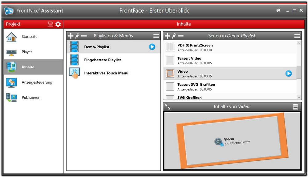 Die FrontFace-Software besteht aus zwei Komponenten, dem FrontFace Assistant zur Erstellung, Pflege und Verwaltung des Systems und der Inhalte und dem FrontFace Player zum Abspielen bzw. Konsumieren der Inhalte durch den Endanwender.