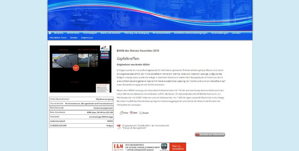 Seit 20 Jahren informiert die BHKW-Infozentrum GbR auf zahlreichen Webseiten sowie in Fachzeitschriften über neue Technologien im Bereich alternativer und regenerativer Energieerzeugung mittels Blockheizkraftwerken (BHKW). Außerdem werden die Veränderungen der gesetzlichen Rahmenbedingungen für BHKW-Anlagen und Anlagen der Kraft-Wärme-Kopplung (KWK) erläutert.
