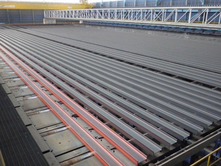Das mit einem neuen Aerosolkühlsystem ausgestattete Kühlbett sorgt für eine effektivere Abkühlung der warmgewalzten Erzeugnisse und so für eine Produktivitätssteigerung. Zusätzlich wird in das Kühl-bett eine neue Hochstell- und Umlegevorrichtung für I- und H-Träger integriert, die den Kühlbettdurchsatz für diese Produkte weiter erhöht. So ist CELSA Barcelona dank des Umbaus in der Lage, HEA y HEB de 600 herzustellen und dadurch das Portfolio zu erweitern sowie die Effizienz der Produktion zu steigern.