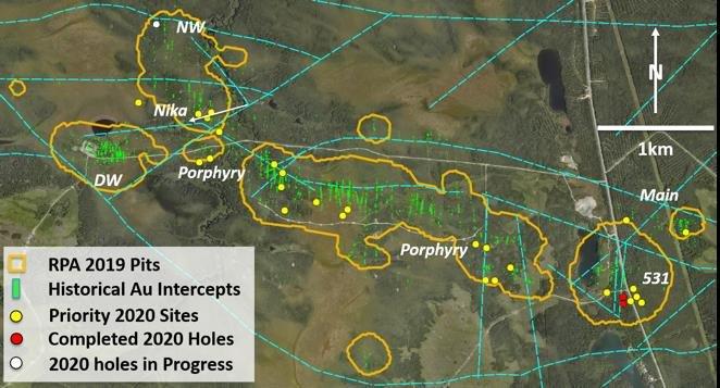 Die Zone Nika wurde zusammen mit dem Entdeckungsbohrloch des Unternehmens aus dem Jahr 2018 (DO-18-217) eingerichtet, das 51 m mit 1,77 g/t Au durchschnitt. Im Jahr 2019 schloss das Unternehmen zwei sehr aggressive 200 Meter lange Step-Out-Löcher ab, die beide eine breite, niedriggradigere Halo-Mineralisierung durchschnitten. Die bisherigen Bohrungen in der Zone Nika unterstützten in der jüngsten Ressourcenschätzung eine neue konzeptuelle Grube, die über 100.000 abgeleitete Unzen mit durchschnittlichen Lagerstättengehalten (RPA 2019) beitrug. Die Bohrungen in der Zone Nika im Jahr 2020 werden zusätzliche Infill-Bohrungen umfassen, die darauf abzielen, die neigungsaufwärts gerichtete oder oberflächennahe Ausprägung der zuvor entdeckten hochgradigen Mineralisierung besser zu definieren und einige der Bohrlöcher auf der Ostseite von Nika weiter aufzufüllen, um die Ressource in dieser Richtung zu erweitern. Die signifikante Mineralisierung setzt sich über 300 m über die aktuellen Grenzen der Nika-Grube hinaus fort, so dass erfolgreiche Bohrungen innerhalb der aktuellen Lückenbereiche das Potenzial haben, deutlich mehr Mineralisierung in die Grube zu bringen und/oder die Dimensionen der aktuellen Grube zu erweitern.