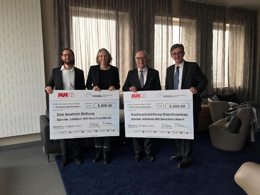 Wer über 125 Jahre erfolgreich am Markt besteht, braucht nicht nur Talent, sondern auch eine Portion Glück und vor allem Partner, auf die man sich verlassen kann. Diese Gewissheit nahm sich der MM Maschinenmarkt zum Anlass für eine besondere Aktion im Rahmen der Jubiläumsfeierlichkeiten. Gemeinsam mit den Partnerunternehmen Trumpf, Demag Cranes, Jung, Jungheinrich, Murrplastik, Paul Horn, Bimatec, Röhm, Mesago und Nürnberg Messe spendete das Fachmedium je 5300 Euro an die Nachwuchsstiftung Maschinenbau, die Dirk-Nowitzki-Stiftung und Ärzte ohne Grenzen. „Diese drei Einrichtungen fassen das zusammen, was uns als Medium wichtig ist“, erklärt MM-Chefredakteur Udo Schnell. „Natürlich liegen uns die Nachwuchssorgen im Maschinenbau sehr nahe. Als internationale Marke sind wir uns aber auch unserer lokalen und globalen Verantwortung bewusst. Dafür stehen Dirk Nowitzki, ein Sohn Würzburgs, und die Non-Profit-Organisation Ärzte ohne Grenzen.“