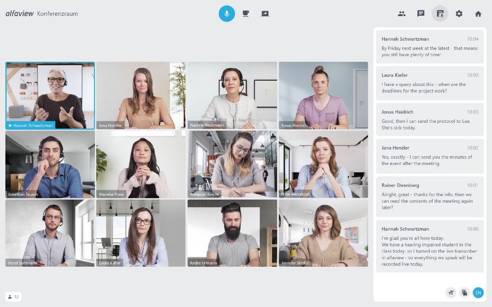 Mit alfaview® können 20, 50, 100 oder mehr Personen gleichzeitig mit Video und Audio vernetzt werden – weltweit und in Echtzeit. Im virtuellen Raum haben alle Nutzer die Möglichkeit, sich zu sehen, zu hören und im Team standortübergreifend an Projekten zu arbeiten. Der Live-Protokollierer in alfaview® ermöglicht Ihnen, den gesamten Inhalt Ihres Meetings oder Ihrer Online-Schulung zu protokollieren und simultan in alle Sprachen der Welt zu übersetzen.