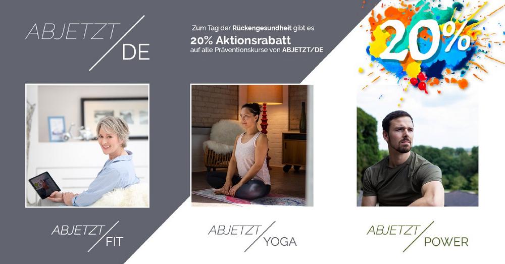 Passend zum diesjährigen Schwerpunkt ‚Achtsamkeit‘ beteiligt sich die Deutsche Arzt AG erneut am Tag der Rückengesundheit. Der achtsame Ansatz ist mittlerweile fester Bestandteil moderner Rückentherapie und -prävention, denn Achtsamkeit und Körperwahrnehmung können die Rückengesundheit und Lebensqualität maßgeblich fördern. Die nach §20 SGB V zertifizierten Präventionskurse ABJETZT/YOGA, ABJETZT/FIT und ABJETZT/POWER wurden von der Deutschen Arzt AG entwickelt und helfen Patienten dabei, Bewegung in den Alltag zu bringen – und das geht bei den online Kursen sogar ganz unabhängig von Ort und Zeit. Sowohl der Yoga- wie auch der Rückenkurs wurden von dem Aktion Gesunder Rücken e.V. (AGR) als besonders rückenfreundlich ausgezeichnet. Im Rahmen der aktuellen Aktion bietet die Deutsche Arzt AG 20% Rabatt auf alle ABJETZT Kurse. Interessierte Teilnehmer lösen dafür einfach den Rabattcode auf der Webseite ein und haben so ganz einfach die Möglichkeit, den jeweiligen Präventionskurs vergünstigt zu erhalten. Die Aktion startet am 15.03.2020 und endet am 22.03.2020 um 23.59 Uhr.