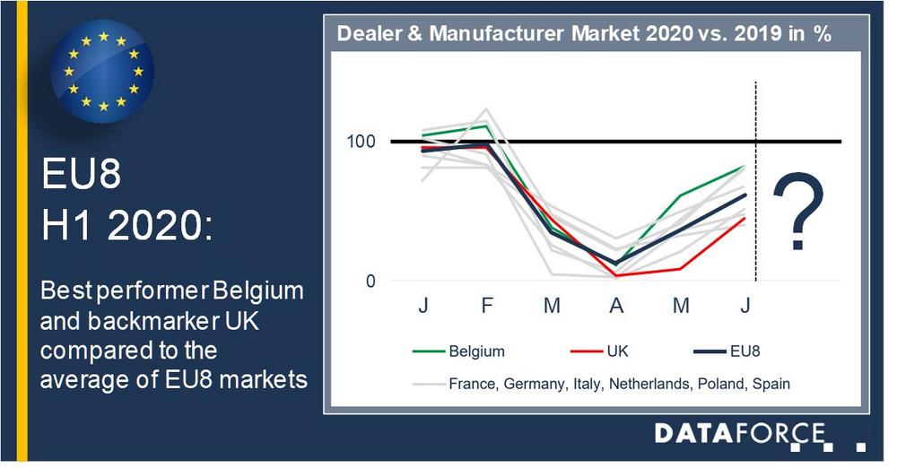 When looking at the recovery of the Dealer and Manufacturer registrations it came as quite a surprise that the quickest market was in fact Belgium. In April this channel was showing a – 88.9% in comparison to 2019. However, for June it was down by just 18.1% and at the half year mark it showed a year to date drop of just 33.2%.