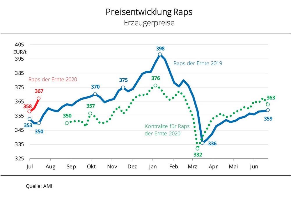 In den vergangenen Wochen sind die Erzeugerpreise für Raps der Ernte 2020 kräftig gestiegen. Seit Anfang Juli 2020 hat sich Raps um rund 9 auf 367 EUR/t verteuert. Damit sind die Forderungen für Raps seit den Jahrestiefständen Mitte März um durchschnittlich 10 % gestiegen. Seit dem Saisonwechsel verlaufen die Rapspreise deutlich über Vorjahresniveau. Mitte Juli lag der Preisvorsprung bei fast 20 EUR/t.