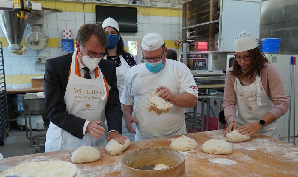Bildunterschrift: Oberkirchenrat Dieter Kaufmann, Bäckermeister Reusch von der Bäckerei Winter und eine Konfirmandin backen „Brot für die Welt“.