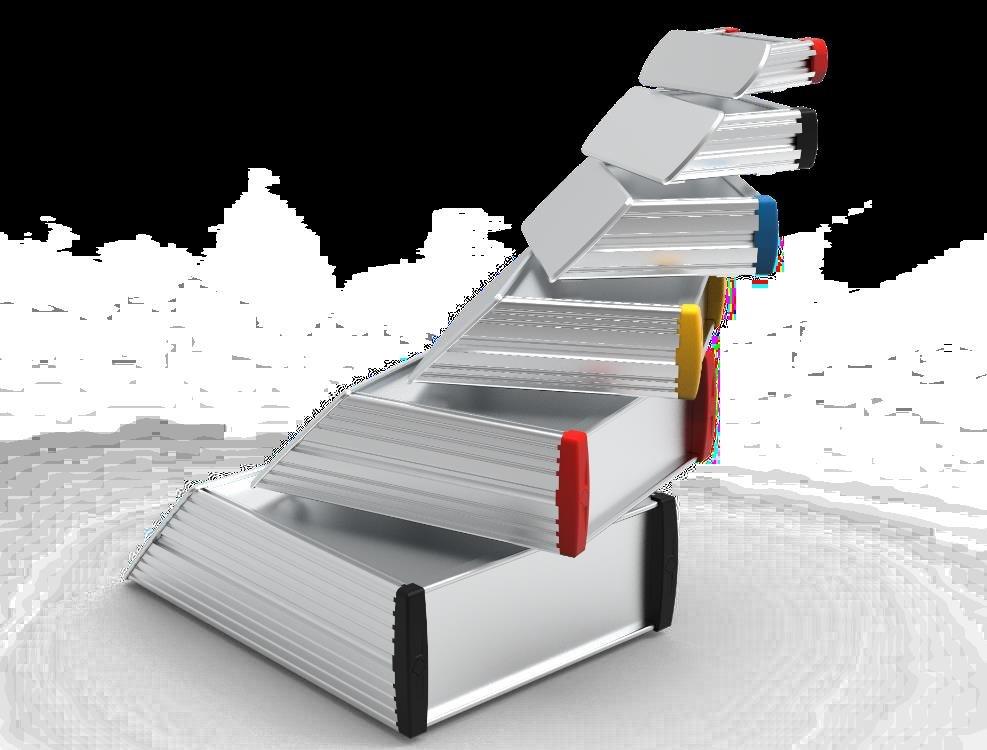 Standardmäßig sind die Profile mit natur eloxierter Oberfläche erhältlich. Die Eckstücke können wahlweise in den Farben schwarz, gelb, blau und rot bestellt werden. Die ergonomisch geneigte Front ist im Standard natur eloxiert kann aber auf Anfrage in weiteren Farben angeboten werden. Passendes Zubehör wie gerade Eckstücke, Zierleisten, Gummifüsse uvm. runden die neue Gehäuse-Serie ab.