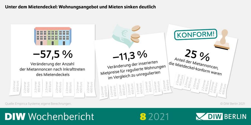 Die StudienautorInnen haben Mietannoncen, die vor und einen Monat nach Inkrafttreten des Mietendeckels geschaltet wurden, ausgewertet, um die unmittelbaren Effekte dieser Mietregulierung auf den Berliner Wohnungsmarkt abzuschätzen. Da die Corona-Pandemie und die Eindämmungsmaßnahmen die Ergebnisse zu verzerren drohten, haben sie die Mietinserate nur bis zum 21. März 2020 unter die Lupe genommen. Lediglich ein Viertel der untersuchten Inserate war tatsächlich Mietendeckel-konform. Unter den Mietendeckel fallen schätzungsweise 95 Prozent des gesamten Mietwohnungsmarkts. Ausgenommen sind lediglich Neubauten ab 2014 und substanziell sanierte Wohnungen, die vorher unbewohnbar waren und leer standen.