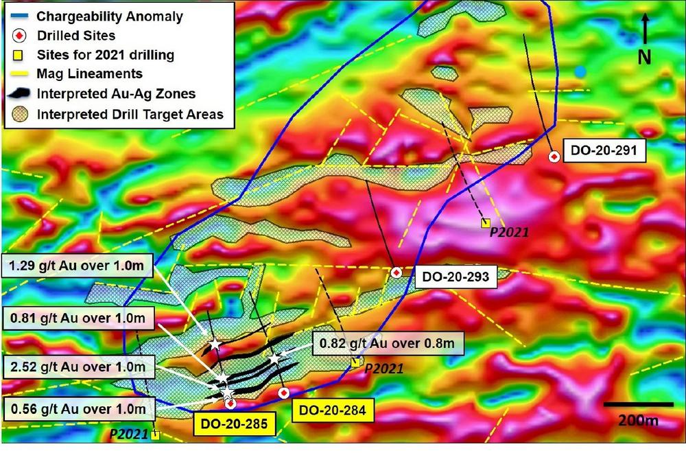 Die Bohrung DO-20-285 war die südwestlichste der vier niedergebrachten Bohrungen. Die Goldvererzung ist weitgehend mit reichlich vorhandenen Sulfiden vergesellschaftet (was sich in erhöhten Schwefelgehalten von 1 % bis über 5 % widerspiegelt). Zu den besten neuen Goldvorkommen zählen 2,52 g/t Au über 1 m aus 65 m Bohrtiefe sowie anomales Silbergehalte (bis zu 68,2 g/t), Arsen (bis zu 0,06 %), Kupfer (bis zu 0,19 %), Antimon (bis zu 0,03%), Molybdän (bis zu 0,007 %) und Tellur (bis zu 47,1 ppm). Ein weiterer Abschnitt aus 323 m Bohrtiefe enthielt 1,29 g/t Au über 0,8 m. Weitere Informationen finden Sie in der Tabelle mit den Bohrergebnissen am Ende dieser Pressemitteilung.
