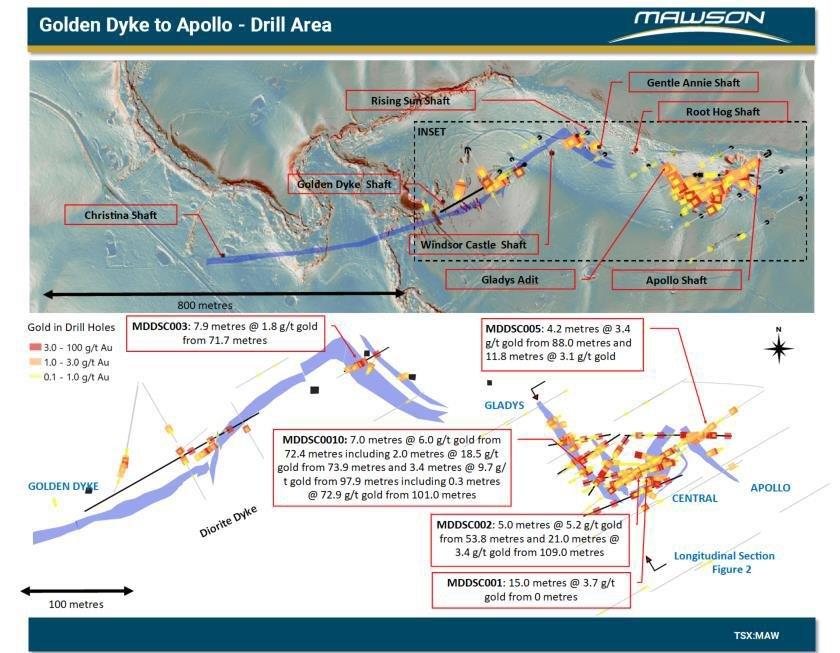 - Apollo (ie: drill hole MDDSC005: 4.2 metres @ 3.4 g/t gold from 88.0 metres and 11.8 metres @ 3.1 g/t gold from 123.7 metres),