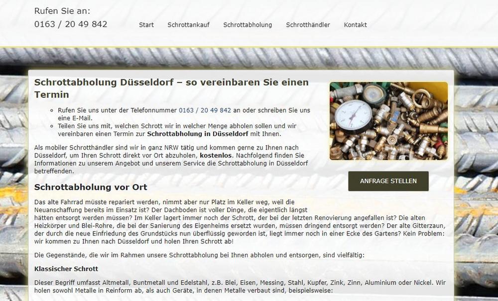Die Schrottabholung Düsseldorf holt alte Haushaltsgeräte, Kfz-Schrott und vieles mehr kostenlos bei seinen Kunden im gesamten Ruhrgebiet ab. Wird seitens der Kunden ein Mindestvolumen erreicht, kann der Metallschrott außerdem angekauft werden. Für die Abgabe eines Angebots benötigt der Schrotthändler Angaben zu Menge und Art des Schrotts. Der Ankaufpreis wird per Überweisung oder Barzahlung beglichen. Auch diesbezüglich richtet sich die Schrottabholung Düsseldorf nach den Wünschen der Kunden