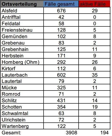 13 Neuinfektionen mit dem Corona-Virus meldet das Gesundheitsamt des Vogelsbergkreises am Freitag. Damit schlagen seit Beginn der Corona-Pandemie insgesamt 3908 Infektionen im Kreisgebiet zu Buche. Das Gesundheitsamt betreut zurzeit 194 aktive Fälle – elf Menschen haben sich als genesen gemeldet.