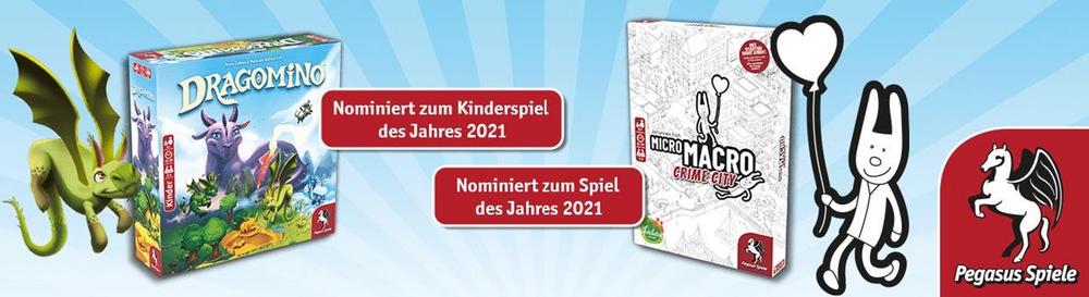 Auch 2021 darf sich Pegasus Spiele über Nominierungen und Empfehlungen für alle drei Kategorien des weltweit bedeutendsten Jurypreises für Brettspiele freuen. In der Kategorie Spiel des Jahres ist MicroMacro: Crime City, erschienen bei der Edition Spielwiese, eines von drei nominierten Spielen. Ein bis vier Spielende ab zehn Jahren lösen bei dem innovativen Detektivspiel von Johannes Sich, das kürzlich bereits mit dem Beeple Award ausgezeichnet wurde, 16 spannende Fälle mit verschiedenen Schwierigkeitsstufen. Dazu gehen sie auf einem 75 x 110 cm großen, illustrierten Wimmelbild-Stadtplan auf Verbrecherjagd. Schritt für Schritt rätseln sich die Spielenden anhand der Aufgabenkarten eines Falls vom Tatort über Hinweise, Indizien und Beweise bis zum Täter selbst. Ein aufmerksames Auge sowie kreative Kombinationsgabe helfen dabei, die zahlreichen Rätsel und Geheimnisse in Crime City zu entdecken und die Fälle zu Lösen.