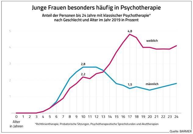 Während die jungen Frauen insbesondere ab dem Ende der Pubertät vermehrt in Behandlung seien, lägen die Jungen vor und zum Beginn der Pubertät noch vorn. Im Alter von zehn Jahren seien 2,8 Prozent oder circa 10.700 Jungen in Behandlung. Dem stünden 2,2 Prozent der Mädchen beziehungsweise rund 7.800 Betroffene gegenüber. Besonders häufig seien Jungen wegen Störungen des Sozialverhaltens, ADHS sowie Lese- und Rechtschreibstörungen in Therapie. „Je früher psychische Störungen erkannt werden, desto eher kann man sie behandeln, bevor sie sich dauerhaft manifestieren“, so Marschall. Eine gute Hilfe bei der Früherkennung biete das Kinder- und Jugend-Programm der BARMER. Es beinhalte unter anderem Vorsorgeuntersuchungen, die darauf abzielten, psychische Auffälligkeiten, gesundheitliche Defizite oder Entwicklungsstörungen junger Menschen möglichst frühzeitig zu erkennen und zu behandeln. Derzeit nähmen fast 580.000 Kinder und Jugendliche an dem BARMER-Programm teil.