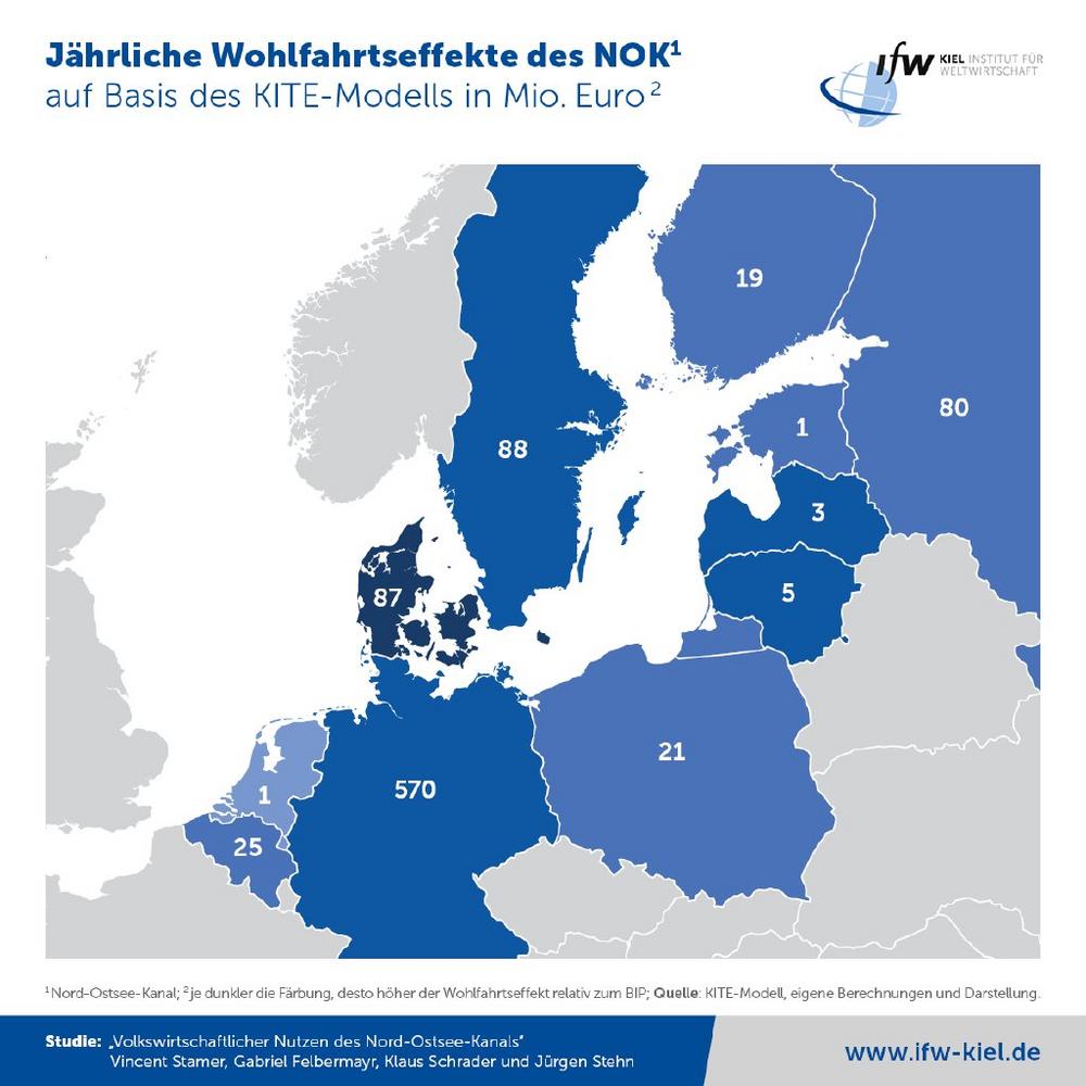 Der positive, gesamtdeutsche Wohlfahrtseffekt durch den Nord-Ostsee-Kanal (NOK) beruht vor allem auf seiner Funktion als Verkehrsachse. Durch kürzere Wege zu den Anrainerstaaten der Ostsee reduziert er die Handelskosten für Exporteure und Importeure deutlich. Deutschland profitiert durch den NOK mit rund 570 Millionen Euro pro Jahr, davon sind gut 140 Millionen Euro Einnahmen von Beschäftigten und Firmen mit direktem NOK-Bezug. Es folgen Dänemark mit 87 und Schweden mit 88 Mio. Euro. Relativ zum Bruttoinlandsprodukt profitiert Dänemark am stärksten. Die Berechnungen sind Teil einer Studie des IfW Kiel im Auftrag der Initiative Kiel-Canal e.V. (Stamer, Felbermayr, Schrader, Stehn: „Volkswirtschaftlicher Nutzen des Nord-Ostsee-Kanals“).
