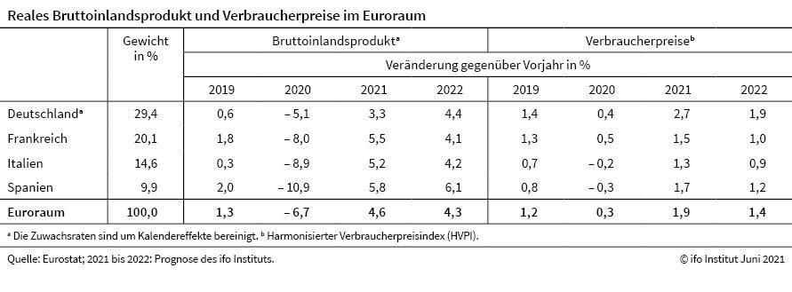 Das ifo Institut wird weiterhin Prognosen für den Euroraum erstellen. So ist am 16. Juni die jüngste Vorhersage unter dem Titel „Deutsche Wirtschaft im Spannungsfeld zwischen Öffnungen und Lieferengpässen“ erschienen. Der erste Abschnitt widmete sich der Lage und Prognose der Weltwirtschaft. Dort finden sich die Eckwerte für den Euroraum insgesamt und die vier größten Volkswirtschaften tabellarisch zusammengefasst.