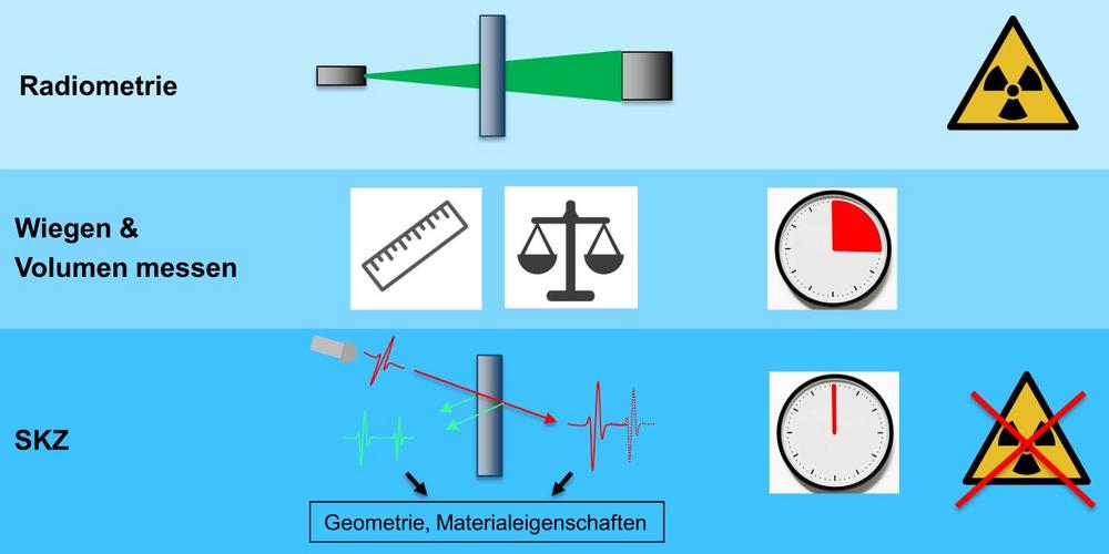 Mit diesen Problematiken haben sich Wissenschaftler am Kunststoff-Zentrum SKZ in den letzten zehn Jahre intensiv beschäftigt. Heute ist es dank neuer Technologien möglich, die Dichte und damit auch das Flächengewicht inline, berührungslos, zerstörungsfrei und ganz ohne Einsatz gesundheits- und umweltgefährdender Strahlung zu messen. Sollte zusätzlich noch die Dicke des Produkts gemessen werden, musste bisher ein zweites Messsystem eingesetzt werden, da konventionell bisher nur die Intensität der Strahlung erfasst wird. Anders verläuft es sich am SKZ: Hier wird automatisch auch die Dicke des zu messenden Produkts, respektive die Geometrie, quantifiziert und steht als Zusatzinformation zur Verfügung.
