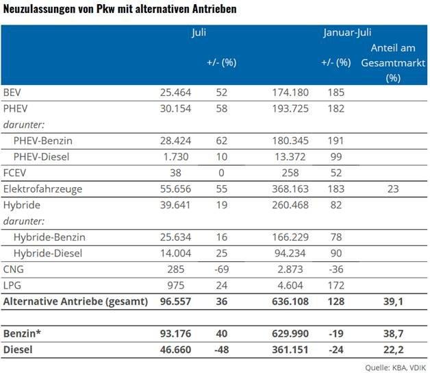 Im gesamten Pkw-Markt verschieben sich die Gewichte weiter in Richtung der alternativen Antriebe. Sie kamen in den ersten sieben Monaten auf einen Anteil am Gesamtmarkt von 39 Prozent. Benziner lagen bei knapp 39 Prozent. Weniger als jeder vierte Neuwagen ist ein herkömmlicher Diesel (22 Prozent).