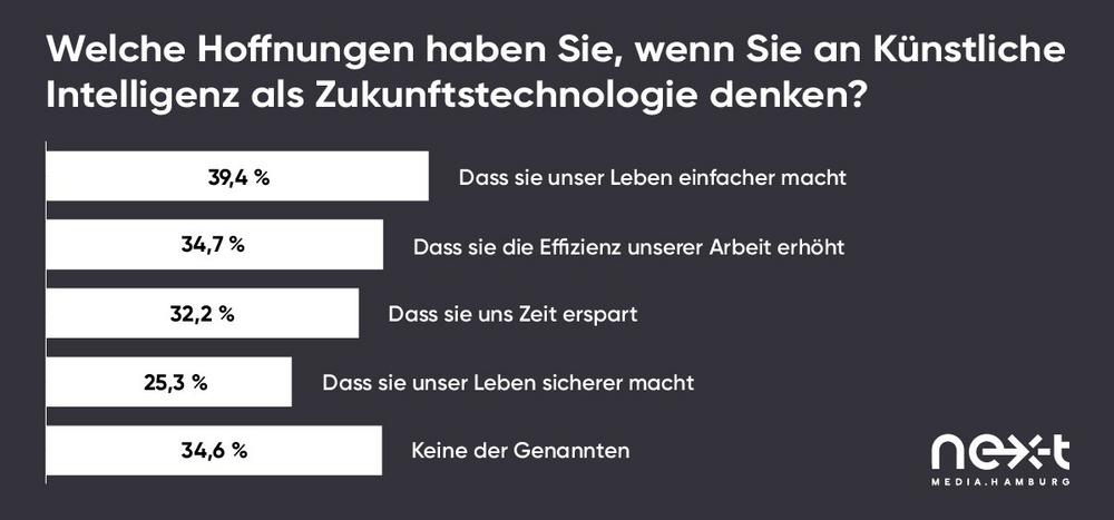 Unabhängig vom Thema Deepfakes knüpfen die Menschen in Deutschland überwiegend Hoffnungen an Künstliche Intelligenz als Zukunftstechnologie. Viele glauben, dass KI ihr Leben einfacher (39,4 Prozent) und sicherer (25,3 Prozent) macht. Und jeweils rund jede*r Dritte hofft, dass sich dank KI die Effizienz der eigenen Arbeit erhöht (34,7 Prozent) und Zeit gespart wird (32,2 Prozent). Aber auch Skeptiker*innen gibt es: 34,6 Prozent der Befragten versprechen sich durch KI nichts von alledem.