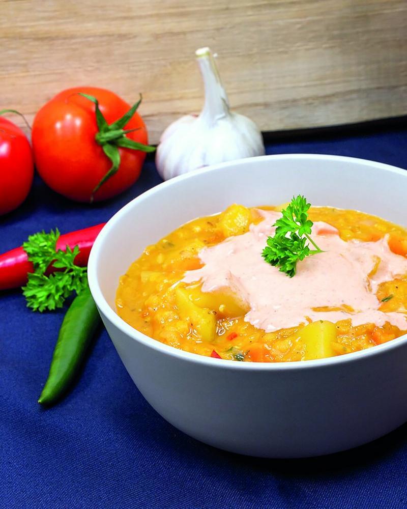 So geht’s: Um die Suppe zuzubereiten, 300 g festkochende Kartoffeln sowie 250 g Karotten waschen, schälen und vierteln. 250 g Tomaten in Würfel schneiden. Danach eine Chilischote putzen und würfeln. Rund 5 Petersilienstängel waschen, trocken tupfen und grob hacken. Eine Zwiebel und eine Knoblauchzehe schälen und fein würfeln. 150 g rote Linsen in ein Sieb geben und unter warmem, fließendem Wasser auswaschen, bis das Wasser klar ist. Anschließend einen Esslöffel Butter in einem Topf schmelzen, die Zwiebelwürfel hinzugeben und kurz anbraten. Nun die Tomatenstücke, die Karottenwürfel, die gewürfelte halbe Chilischote und den fein gehackten Knoblauch sowie die Kartoffelstücke, die roten Linsen und 1 TL edelsüßes Paprikapulver hinzugeben. Das Ganze mit 700 ml Gemüsebrühe aufgießen und circa 20 Minuten köcheln lassen. Nach der Kochzeit die gehackte Petersilie hinzugeben und die Suppe mit dem Saft einer Zitrone sowie etwas Salz und Pfeffer abschmecken. Für den Klacks Frische kann die fertige Suppe noch mit einem Joghurt-Dipp serviert werden. Dieser lässt sich aus 200 g griechischem Joghurt, dem Saft einer Zitrone und Salz und Pfeffer zubereiten.