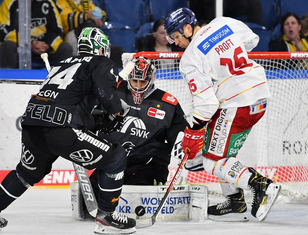 Das Spiel: Ein höchst unglücklicher Beginn! Schon nach wenigen Szenen musste Daniel Fischbuch wegen eines Hohen Stocks runter und die DEG dadurch in früher Unterzahl. Dazu verletzte sich unmittelbar danach auch noch Brett Olson und musste humpelnd das Eis verlassen. Erinnerungen an das erste Spiel der Saison wurden wach, als Joonas Järvinen ähnlich früh ausfiel. Zu allem Überfluss nutzte der KEV das Powerplay sofort aus und traf durch Sabolic zum 1:0 (3:19). Die DEG kam danach besser ins Spiel und zu ersten Chancen durch Barta, Eder und Fischbuch. In der Düsseldorfer Drangphase hatten die Gäste aber obendrein Glück, als ein Krefelder Schuss die Latte streifte. Die DEG drängte weiter auf den Ausgleich, als die nächste kalte Dusche kam: Eddi Lewandowski konnte ein Zuspiel schön aufnehmen und den Puck unter Hane hindurch zum 2:0 einschieben (17:25). Respekt für den Veteran! Und es kam noch schlimmer: Wenige Sekunden vor Drittelende konnte Krefelds Mirko Sacher ungestört zum Tor ziehen und ebenfalls verwandeln (19:50). Ein bitteres Drittel!