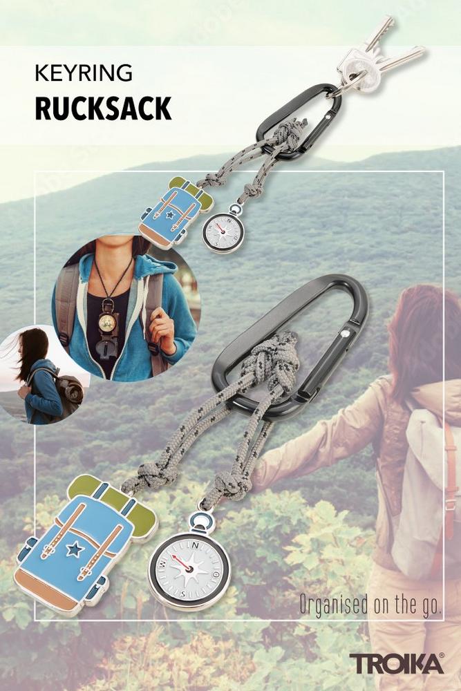 Keyring incl. carabiner, 2 pendants on decorative climbing rope: Hiking backpack and compass, aluminium / cast metal / enamel / nylon, Multicoloured