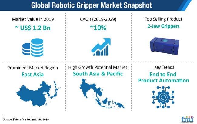 The global robotic gripper market was valued at ~ US$1 Bn in 2018 and is projected to increase at a CAGR of ~ 10% between the forecast period of 2019 and 2029. This growth is significantly driven upsurge in the automotive and electronic & semiconductor industry, introduction of specific gripper portfolio, and rise in the robotic automation in specific regions such as East Asia.