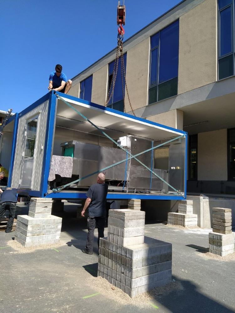 Da der Umbau im laufenden Betrieb erfolgen muss, wurde nun eine Containeranlage aufgebaut, in der die Interims-Spülküche eingebaut ist. Bis August sollen die Arbeiten fertig gestellt sein.
