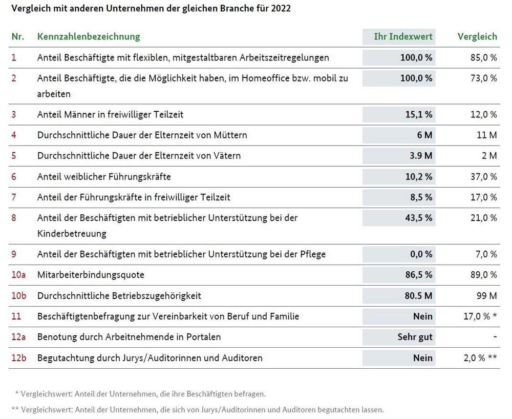 Die Ergebnisse des Fortschrittindex müssen wir nicht verstecken: Vor allem bei flexiblen Arbeitszei-ten aber auch bei Elternzeiten bei Vätern oder der betrieblichen Unterstützung der Kinderbetreu-ung liegen wir bis zu 20 Prozent über dem Durchschnitt. Insbesondere beim Anteil der weiblichen Führungskräfte können wir noch besser werden.