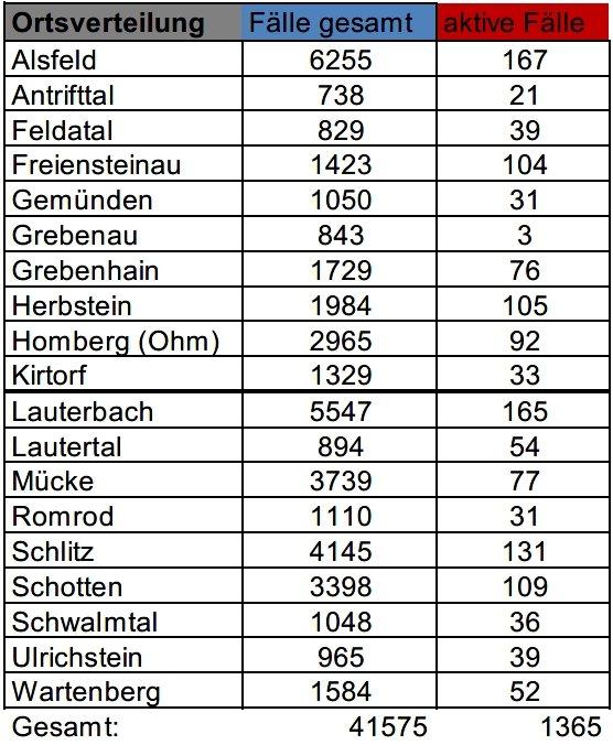Das Gesundheitsamt des Vogelsbergkreis meldet über das Wochenende bis Dienstag 150 Neuinfektionen mit SARS-CoV-2 im Kreisgebiet. Weiterhin wurden 209 Genesene registriert. Aktuell werden somit 1.365 aktive Fälle betreut.
