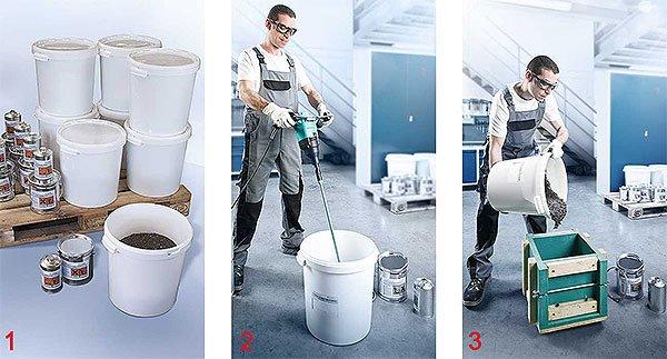 - Einfaches Vermischen im mitgelieferten Eimer mit langsam laufendem Rührwerk.