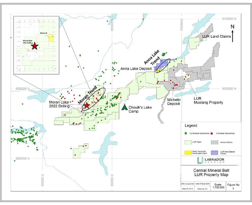 Stephen Keith, CEO of LUR, commented, “We are very pleased to announce this purchase. This Acquisition will add additional uranium properties to the LUR portfolio with historical mineral resources at Anna Lake and additional exploration targets at both Anna Lake and the Moran Lake B Zone prospect, which we believe will create potential upside for the Company and its shareholders. The Anna Lake Project completes a strategic land package that contains multiple uranium and polymetallic targets. The Moran Lake B zone prospects strategically adds to our Moran Lake Project and provides LUR with additional exploration targets.”