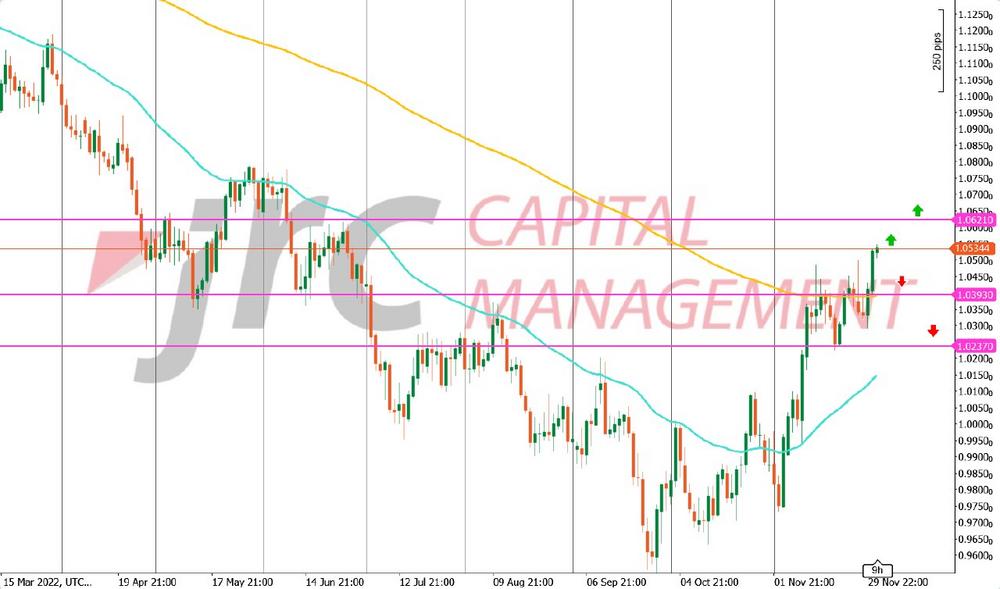 Nach dem Börsenschluss am Donnerstag bei ca. $1,0527 zeigt das Währungspaar am Montag erneut stark und stieg fast 1,2%. Heute bewegte sich der Kurs bisher mit 0,06% weiter leicht nach oben. Im mittelfristigen Aufwärtstrend hat der Kurs am 21.11. ein zwischenzeitliches Tief bei ca. $1,0245 markiert. Mit dem heutigen Abstieg hat der EUR/USD wieder ein neues Hoch nach der Parität erreicht. Mit der aktuellen Erholungsbewegung hat der Kurs außerdem den 50-Tage-Moving Average überschritten. Gründe für den Anstieg lassen sich unter anderem in den gestern veröffentlichten Wirtschaftszahlen aus den USA finden, wo unter anderem die Arbeitslosenzahlen veröffentlicht wurden.
