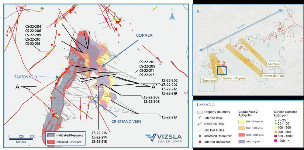 Drilling at Copala has now traced mineralization along approximately 1,000 metres of strike length and approximately 400 metres down dip. High-grade silver-gold mineralization remains open to the north and southeast with ongoing detailed structural and geologic interpretations indicating the potential for mineralization to continue into the footwall side of the Tajitos Vein. The ongoing infill-drilling program, which consists of 25 holes drilled at 25 metre centers, was designed to assess grade continuity and to provide sample material for future metallurgical tests. To date, infill-holes CS-22-201, CS-22-205, CS-22-214, CS-22-216 and CS-22-218 have confirmed high-grade at tighter spacing. Additionally, step-out holes drilled to the east, particularly holes CS-22-202, CS-22-207 and CS-22-219, suggest an uplifted block of basement metasediments in fault-contact with andesites and diorite (see figures 2 and 4). Vizsla´s team is working on interpretations to determine the amount of displacement by the fault, to define a target elevation for Copala type mineralization on the footwall side (east) of the fault; i.e. an uplifted block on the east creates potential for Copala type mineralization at shallower elevation. Vizsla plans to test this hypothesis with drill-holes collared on the footwall side of the fault.