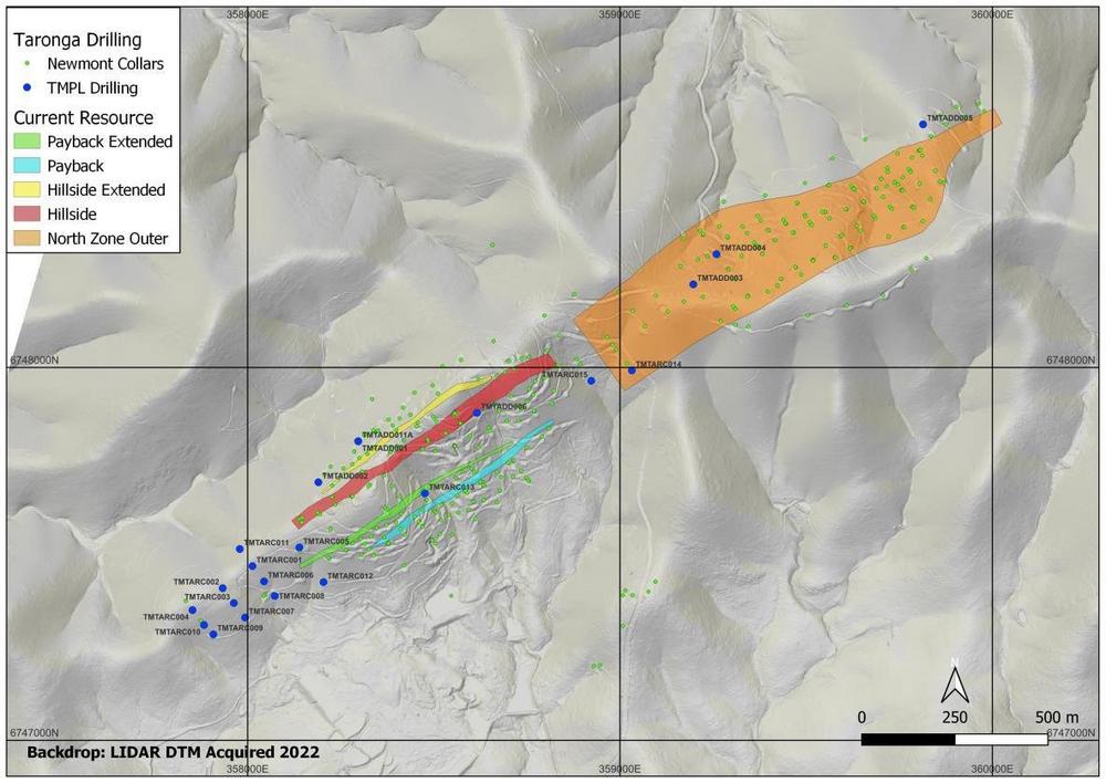 Dieses Bohrprogramm wurde auch konzipiert, um die Lücken in den aktuellen Bohrungen zwischen der zuvor interpretierten North Zone und der South Zone (Newmont-Interpretation) zu schließen und die Bohrdichte in mehreren Gebieten zu verbessern, in denen es wahrscheinlich ist, dass innerhalb des aktuellen Ressourcengebiets die Ressourcen der Kategorie „vermutet“ in die Kategorie „angedeutet“ hochgestuft werden könnten.