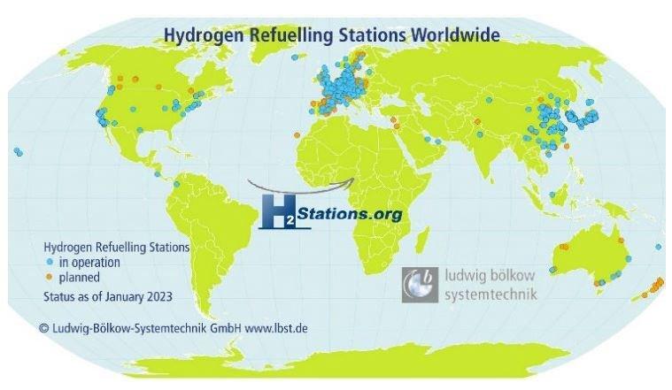 At the end of 2022, 814 hydrogen refuelling stations were in operation worldwide. Concrete plans are already in place for 315 additional refuelling station locations. You can now fill up with hydrogen in 37 countries, Columbia, Cyprus, and Israel being the latest additions to the list.
