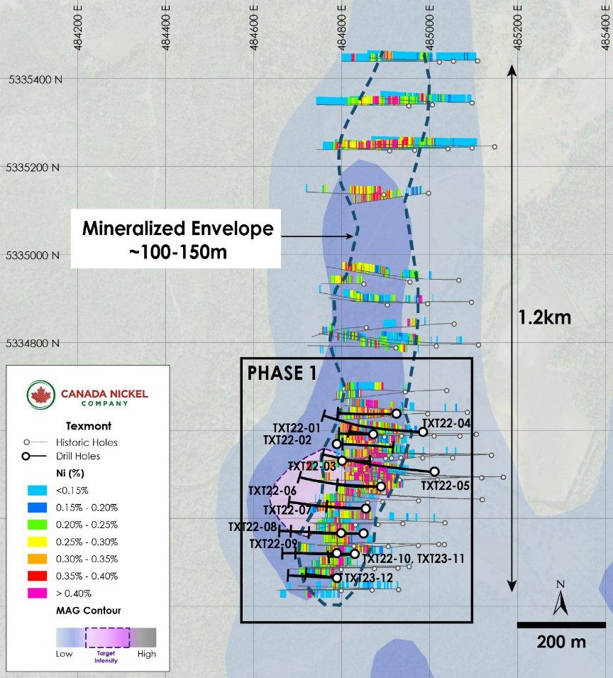 Mark Selby, Chair & CEO of Canada Nickel Company, said, “We are excited by the results of our initial phase of drilling and assay results at Texmont which confirm our thesis of near-surface, high grade intervals of nickel that is present within thick mineralized sections, which support the potential for nearterm, smaller scale, open pit production. This near-term production potential is highly complementary to our large-scale Crawford and regional nickel sulphide project.”