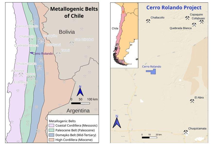 The Cerro Rolando project is located within the Paleocene metallogenic belt about 100 km northwest of Calama, in Region 2 of northern Chile. The project consists of 16 contiguous exploration concessions covering a total of 48km2. Elevation in the area ranges from 1290m in the east to 1050m in the west. The project is accessible using existing roads and tracks.