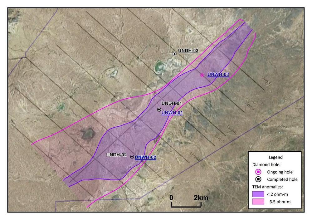 – UNWH-03 currently at 82m - Previously stated results on the drilling of three lithological diamond core drill holes for a total depth of 954m: notable two metre drill core results Include: