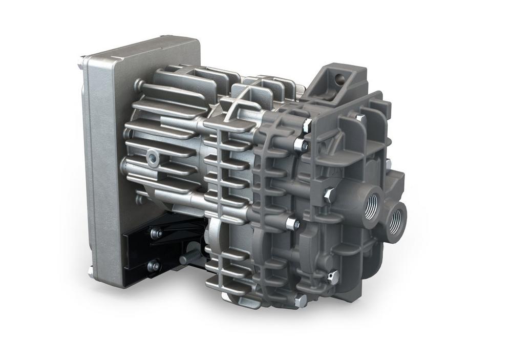 The hydrogen recirculation blower operates according to the proven claw principle. Compression is completely oil- and contact-free. Two claw-shaped rotors rotate in opposite directions inside a housing. Due to the shape of the claw rotors, the already pre-compressed hydrogen is suctioned in and compressed up to 0.4 hPa (mbar) further and fed back into the hydrogen supply before the anode. Small clearances between the claw rotors and the housing optimize the inner seal. A special coating of all parts exposed to hydrogen prevents corrosion due to the deionized water vapor that is also conveyed. A synchronized gearbox maintains precise rotor timing. It is lifetime-lubricated by a special oil. No oil change or other maintenance work is required.
