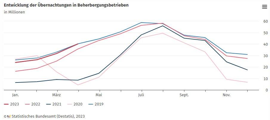 Die Zahl der Übernachtungen von Gästen aus dem Inland stieg im April 2023 gegenüber dem Vorjahresmonat um 9,9 % auf 33,9 Millionen. Das waren 2,6 % mehr Übernachtungen als im April 2019. Die Zahl der Übernachtungen von Gästen aus dem Ausland erhöhte sich im Vergleich zum Vorjahresmonat um 28,5 % auf 6,3 Millionen, lag aber damit noch 13,2 % unter dem Vorkrisenniveau von April 2019.