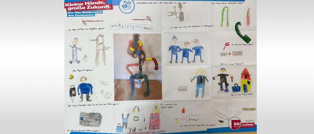 Den Kita-Wettbewerb gab es in diesem Jahr bereits zum zehnten Mal. Unter dem Motto „Kleine Hände, große Zukunft“ nutzen die kleinen Handwerker die Möglichkeit, sich einem bestimmten handwerklichen Thema zu stellen, dazu zu experimentieren und ihre Erlebnisse in Form eines Riesenposters zu verarbeiten, in dem sie ihre Eindrücke festhalten. Im Jubiläumsjahr haben sich 260 Kitas aus ganz Deutschland dem Erkunden des Handwerks und seiner Berufe gewidmet – ein Rekordergebnis. Eine Expertenjury mit Vertretern aus Handwerk und Frühpädagogik kürte am Ende die insgesamt elf Landessieger, die sich über ein Preisgeld von je 500 Euro für ein Kita-Fest oder einen Projekttag zum Thema Handwerk freuen durften.