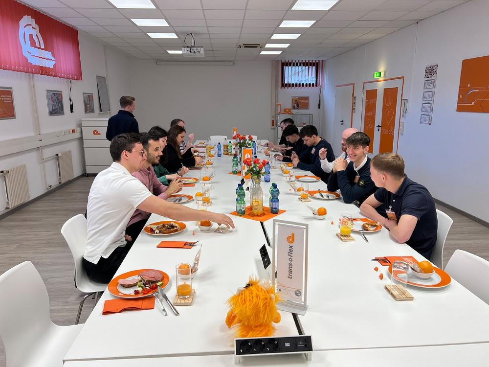 „Hier kocht der Chef persönlich“, steht in weißer Schrift auf der schwarzen Schürze, die trans-o-flex-Chef Wolfgang P. Albeck heute übergezogen hat. 50 Eier, einen Strauß Schnittlauch und fünf Pakete gekochten Schinken wird er heute zu Rühreiern verarbeiten. Verspeist werden sie von 15 Auszubildenden und Studenten, die zum traditionellen Azubi-Frühstück in einen Besprechungsraum in der Weinheimer Zentrale des Expressdienstes gekommen sind. Wer nicht gerade einen Pflichttermin an Schule oder Hochschule hat, der nutzt die Gelegenheit, sich beim ausgiebigen Frühstück zwischen 9.00 und 10.30 Uhr informell mit der Geschäftsführung und untereinander auszutauschen. Insgesamt 61 Ausbildungs- und Studienplätze hat trans-o-flex bundesweit aktuell besetzt. Im Herbst starten 29 junge Menschen neu. Mitte Juni waren noch insgesamt 11 Plätze für duale Studenten oder in klassischen Ausbildungsgängen frei. „Bewerbungen sind noch möglich und wir sind zuversichtlich, dass wir einen Großteil der freien Plätze noch besetzen können“, sagt Albeck, für den die Ausbildung junger Leute auch ein persönliches Anliegen ist.