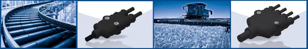 The CONEC junction system provides a flexible way to integrate moulded branches/outlets in electrical connection lines such as e.g. cable harnesses. This ensures that the continuous lead sheathing retains its full functional integrity even at the splice site (at the junction system). The junction system is min. IP67-protected, electrically tested in the factory and thus offers a robust, tamper-proof way to electrify machines in a safe way. The PUR moulding provides good resistance for applications in the agricultural industry.
