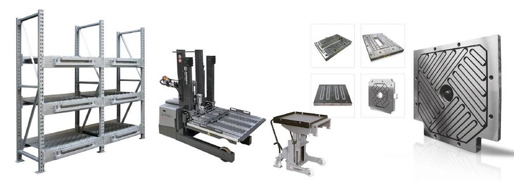 Bei den Werkzeugwechselwagen ergänzt ROEMHELD sein Angebot um die Modelle RWA 2500 und RWA 6000. Sie bieten eine Traglast bis 2,5 beziehungsweise 6 t und verfügen über einen Werkzeug-Wechseltisch mit integrierten hydraulischen Kugelleisten und zusätzlichem Zug-Schub-System, welches das automatische Einschieben der Werkzeuge erleichtert.