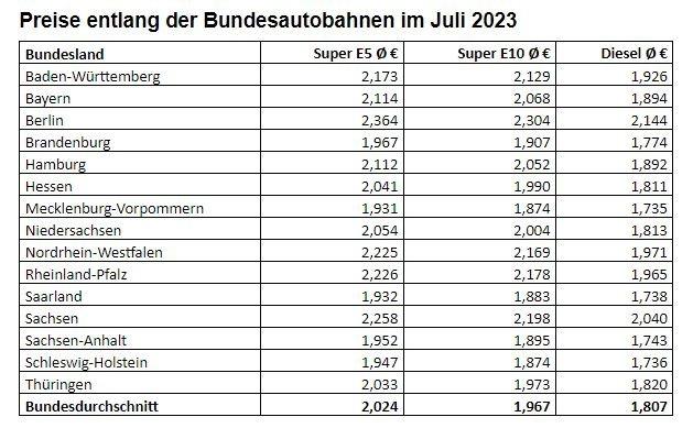 Aber auch im Süden der Republik werden die Autofahrer, die Richtung Österreich, Italien und der Schweiz fahren, überdurchschnittlich zur Kasse gebeten. In Baden-Württemberg stiegen die Preise an den Raststätten um 4 Cent auf 2,17 €, in Bayern verlangten die Autobahnraststätten ebenfalls 4 Cent mehr als im Juni, der Preis stieg auf 2,11 €. Das ist genauso teuer wie in Hamburg, dem Nadelöhr Richtung Norden. Am teuersten waren im Juli die Autobahntankstellen in Berlin mit 2,36 € – das sind 34 Cent über dem Bundesdurchschnitt. Erstaunlich sind bei solch hohen Preisen die deutlich günstigeren Preise in anderen Ländern. So kostete E5 entlang der Ostsee-Autobahn in Mecklenburg-Vorpommern und an den Routen durchs Saarland im Juli nur 1,93 €. Mit 1,95 € waren die Preise auch entlang der Reiserouten in Sachsen-Anhalt und Schleswig-Holstein relativ günstig. Der Preisabstand für Super E5 an den Autobahnen zwischen dem teuersten Land Berlin (2,36 €) und den günstigsten Ländern Mecklenburg-Vorpommern und Saarland (1,93 €) beträgt unerklärliche 43 Cent!