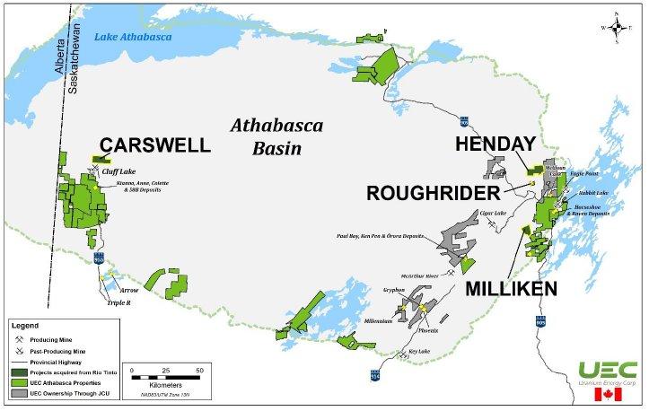 Chris Hamel, Vice President Exploration, Kanada, erklärte: "UEC freut sich, diese strategisch wichtigen Projekte zu unserem bestehenden Athabasca-Portfolio hinzufügen zu können. Alle drei Projekte weisen die Merkmale auf, die wir beim Erwerb von hochwertigen Explorationsanlagen suchen, einschließlich Urananomalien und hydrothermaler Alteration. Darüber hinaus weisen diese Projekte eine exzellente aussichtsreiche Geologie mit minimaler bis gar keiner Sandsteinbedeckung auf, was zu niedrigeren Explorationskosten und kürzeren Fristen bis zur Entdeckung führen wird. Mit unserem Betreiberstatus und den bereits auf Henday, Carswell und Milliken gesammelten Daten bieten diese Projekte starke potenzielle Synergien zu unserem bestehenden Portfolio im Athabasca-Becken."